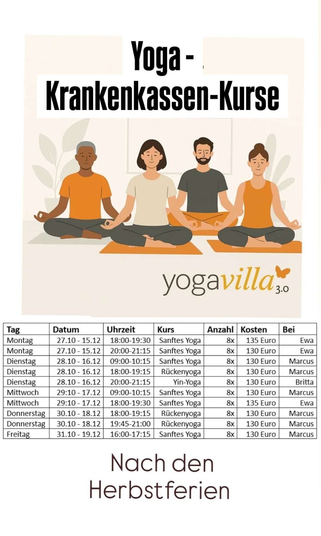 dienstags starten wir auch nach den Herbstferien wieder unseren „Rückenyoga-Kurs“. Die Anmeldungen sind, wie immer, verbindlich. Die Kurse werden mit bis zu 80% von den Krankenkassen bezuschusst.